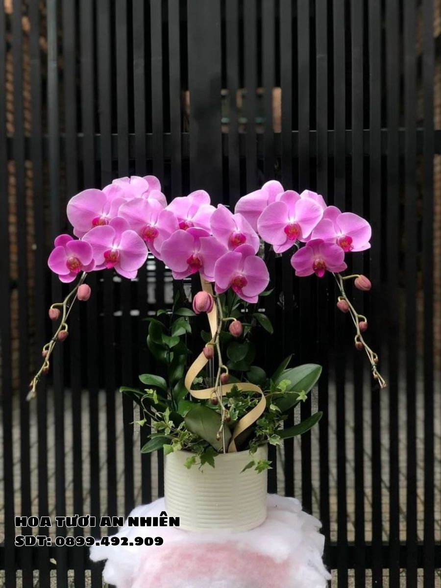 Hoa lan hồ điệp là lựa chọn hàng đầu khi nghĩ đến khai trương nên tặng hoa gì, đặc biệt cho các spa, khách sạn. Loại hoa này mang đến vẻ đẹp đẳng cấp và ý nghĩa thịnh vượng. Lan hồ điệp tím hoặc trắng kết hợp với lá xanh tạo nên lẵng hoa sang trọng, tượng trưng cho sự phát triển. Thiết kế này phù hợp với không gian hiện đại, gây ấn tượng mạnh với khách mời.
